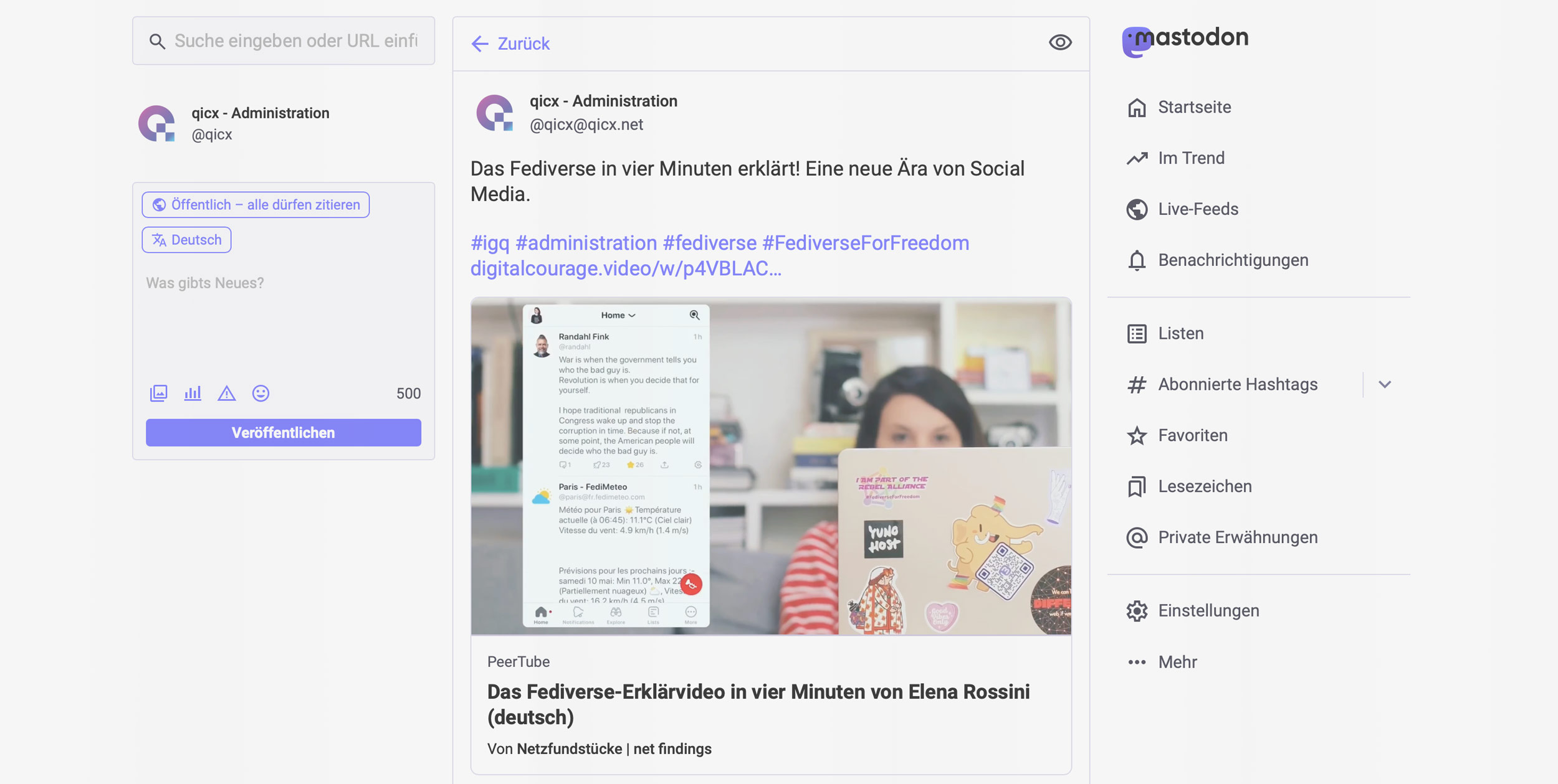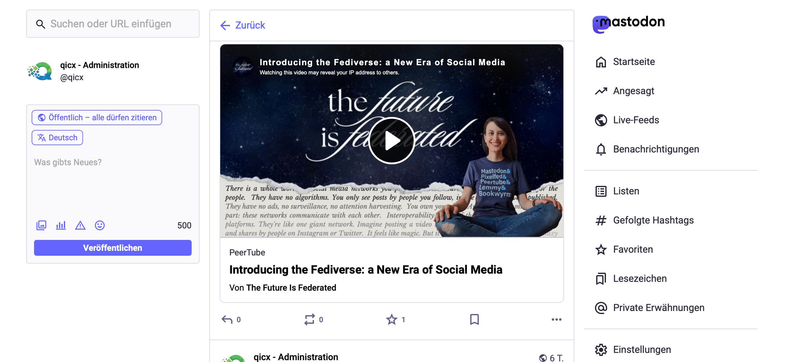 Mache Mastodon zu deinem ganz persönlichen Fleckchen im Internet und starte hier dein Konto! Die Mastodon-App für dein Smartphone findest du im App-Store und gib bei der Instanz einfach „qicx.net“ ein.